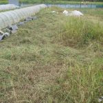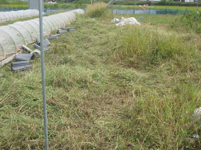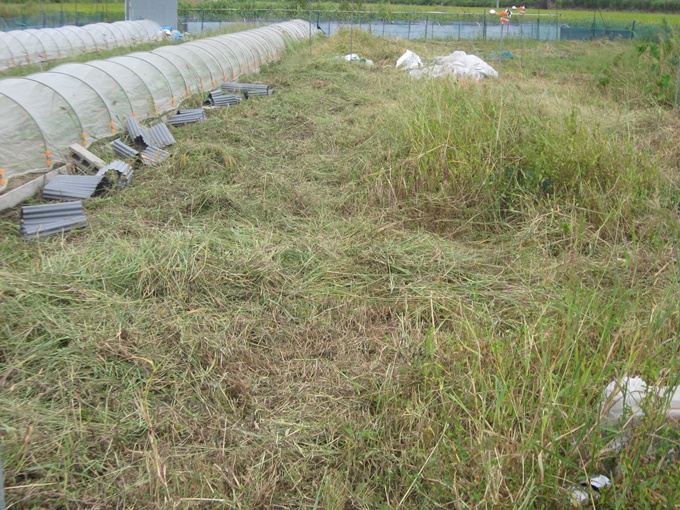 午前9時頃に第一農園に行き、早速草刈り機でメロン用畝の南側のとうもろこし跡地の畝の草刈りをしました。この畝の先にはメロンの小さいトンネルとカボチャの棚があります。メロンのトンネルは簡単に撤収できましたが、カボチャの方は手ごわいです。