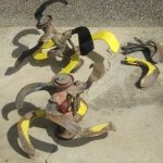 家に戻り早速古い抵抗棒を外そうとしましたが、実は抵抗棒を交換するためには4つのナットを外す必要があったのです。2つは緩めてもらっていましたが、もう2つは緩めてもらっていなかったので地獄に落ちてしまいました。仕方なく納屋の中をのぞくと以前買っておいたM12のT字型のレンチがあり、これを使って外すことを試みました。しかし、これでもなかなか外れず苦労しましたが、なんとか外すことができついに抵抗棒を交換することができました。
