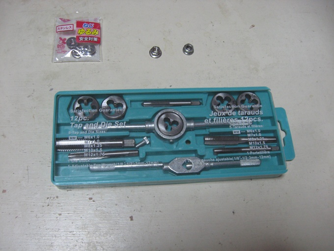 上から2番目の写真が、今回ネットで購入したタップ&ダイスセットです。その上のフランジナットのうち右側のものが、ヤンマーの純正のナットで左側のものがホムセンで買って来たステンレスの汎用ナット4個です。純正のナットと汎用ナットとでサイズなどが微妙に違っています。