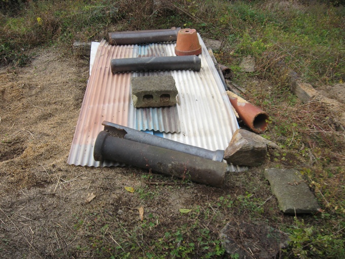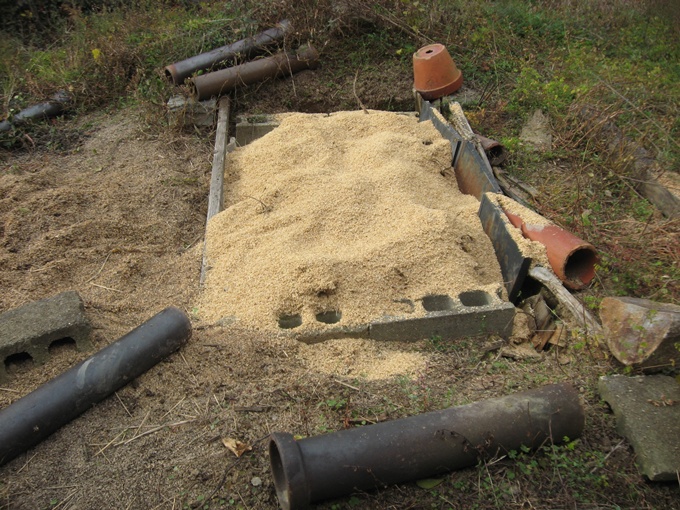 午後になってサトイモの種芋をもう一段上に室に並べられると思い思案しました。その結果、もう少しだけ室に収容しようと考え、もう一度第三農園に行ってまたコンテナー2箱分収穫して来ました。そのうち1箱分だけを室の2段目に並べ、もみ殻を掛けました(上の写真)。