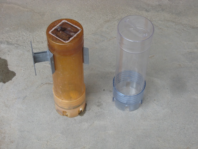 とりあえず塩素剤を入れている薬筒の底部を回して接触面積を小さくしようとしたのですが動きません。写真のように、左側の薬筒がこれまで使用していたものです。もう30年間も使っているため色も変色し固くなってしまっていたのです。