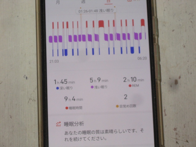 上の写真のように、21:03~06:20までが記録されていて、深い眠り、浅い眠り、REM睡眠がバランスよく表示されていました。『あなたの睡眠の質は素晴らしいです。それを続けてください。』という睡眠分析となっていました。